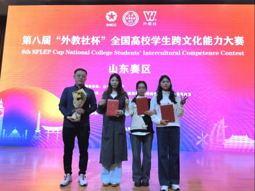 “外教社杯”全国高校学生跨文化能力大赛作为语言文化类一流竞赛平台,是同类竞赛中考察能力最综合、难度最高的一项赛事。本次省赛吸引了包括山东大学、中国海洋大学、中国石油大学、山东师范大学等实力高校在内的60所高校参赛,刷新了参赛团队数量纪录。自比赛筹备阶段开始,学校英语教研室教师全程悉心指导、保驾护航;赛场上,参赛同学沉着应战、从容发挥,最终在激烈角逐中展现出过硬的专业素养与鲜活的青春风采,赢得了评委组高度认可,取得优异成绩。