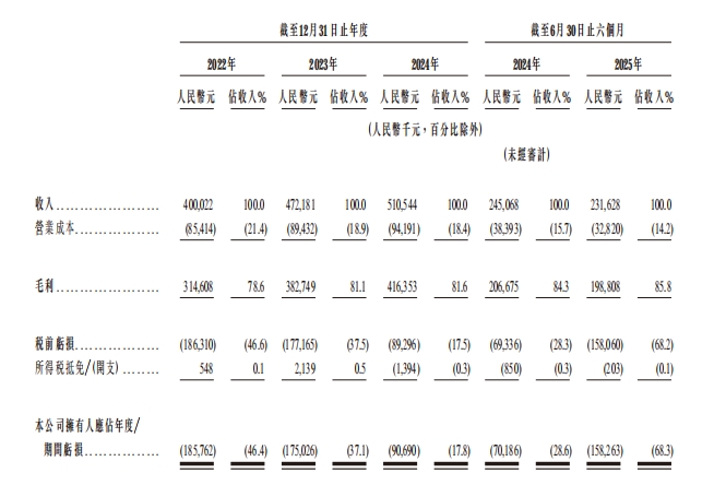 财务表现方面,2022年、2023年、2024年及2025年上半年,该公司的收入分别约为4亿元、4.72亿元、5.11亿元及2.32亿元;同期,该公司毛利分别为3.15亿元、3.83亿元、4.16亿元及1.99亿元,同期毛利率分别为78.6%、81.1%、81.6%及85.8%。