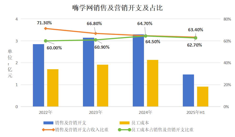 净亏损原因或与销售及营销开支过高有关。于2022年、2023年、2024年以及2025年上半年,该公司产生重大销售及营销开支,分别为人民币2.85亿元、3.15亿元、3.3亿元及1.47亿元,占同期收入的71.3%、66.8%、64.7%及63.4%。
