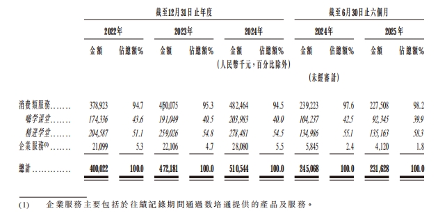 除业务构成集中外,嗨学网的服务类型同样单一。公司收入主要来自消费类服务,少部分来自企业服务。消费类服务2022年、2023年、2024年以及2025年上半年期间占比分别为94.7%、95.3%、94.5%及98.2&,同期企业服务仅占5.3%、4.7%、5.5%及1.8%。