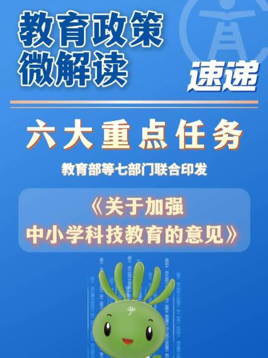 《意见》提出六大重点任务。一是构建协同贯通的育人体系。强化科技教育与人文教育协同,引导学生在动手实践中激发科学兴趣、学习科学方法、培育科学精神。二是建设开放融合的课程生态和教学方式。以学科融合重塑课程教学生态,引导学生综合运用多学科知识解决问题。三是加强素养导向的教研引领和综合评价。建立健全科技教育评价机制,推动教研与教学一体化发展。四是注重形态多样的资源开发和环境建设。优化教学空间,为学生体验真实情境下的科技探究实验和工程技术实践提供平台。依托国家中小学智慧教育平台,建设科技教育栏目,推动优质数字资源共建共享。五是推进高质高效的师资建设和家校社协同。将科技教育全面融入教师培养与培训体系,增强教师实施科技教育的能力素养。依托家校社协同育人“教联体”,共建区域科技教育中心。六是推动广泛深入的国际交流与合作。构建多边合作网络,在全球范围内推动中小学科技教育研究与实践,提升国际影响力与竞争力。