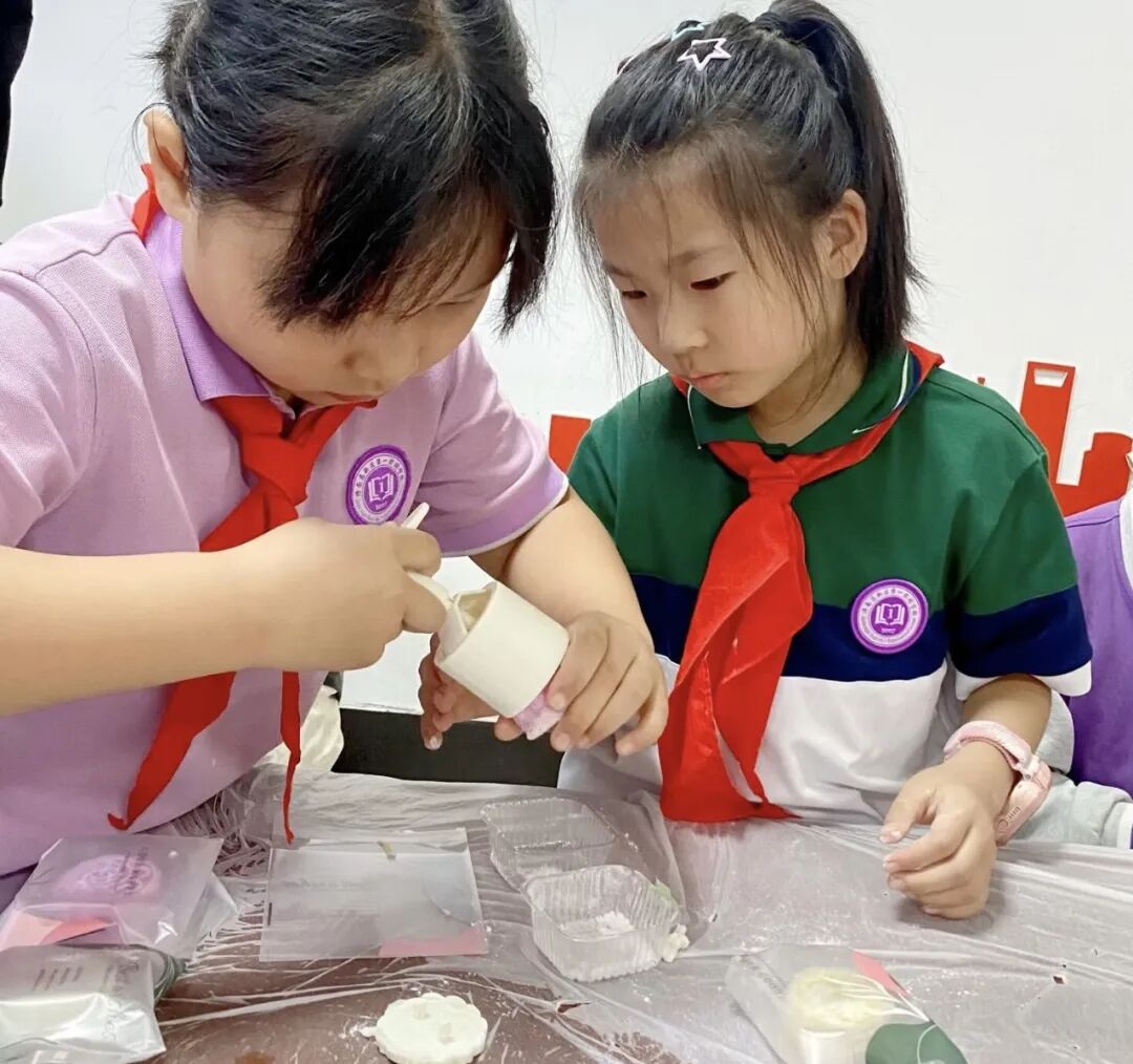 在社区志愿者和家长的指导下,学生们有模有样地揉面、包馅、压模,当一个个印有“团圆”、“如意”等字样的月饼从手中诞生时,孩子们体验到了劳动与创造的快乐,每个人的脸上都露出了无比自豪的笑容。