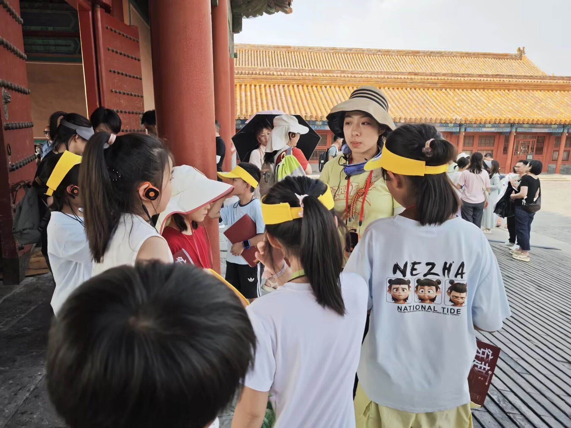 踏入故宫的那一刻,学生们被红墙黄瓦的宏伟建筑群震撼。在太和殿前,姚艳艳手持研学手册,指着殿顶的瑞兽讲解:“最前面的是骑凤仙人,后面跟着十个瑞兽,分别象征不同的吉祥寓意。”孩子们一边听,一边在手册上画出瑞兽轮廓,有的还标注“太和殿瑞兽共11个”。从乾清宫的“正大光明”匾到御花园的太湖石,姚艳艳全程结合历史故事解析文化底蕴,学生们紧紧跟在身后,眼神里满是对这座文化瑰宝的好奇与敬畏,不时停下脚步记录关键信息。
