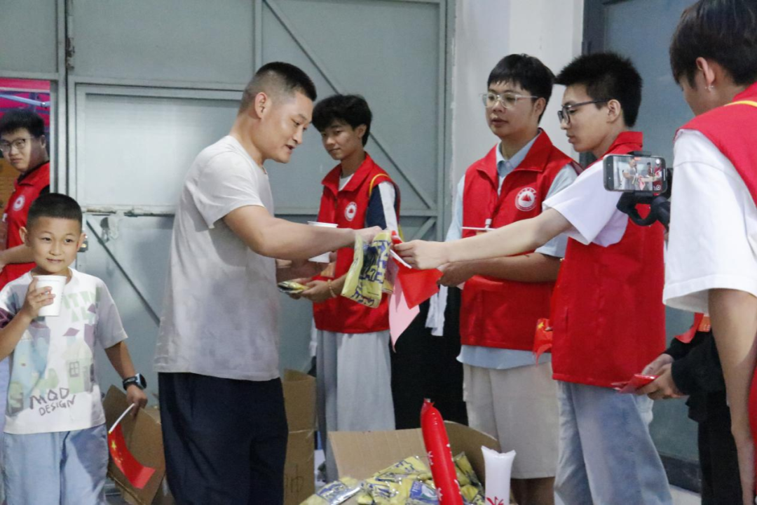 在体育场各入口处的物资分发点,志愿者们忙碌地为观众发放小红旗、应援棒及雨衣等物品。这些小小的物资迅速点燃了现场热情,大家挥舞红旗、呐喊助威,让国庆的喜庆与足球的激情交相辉映。