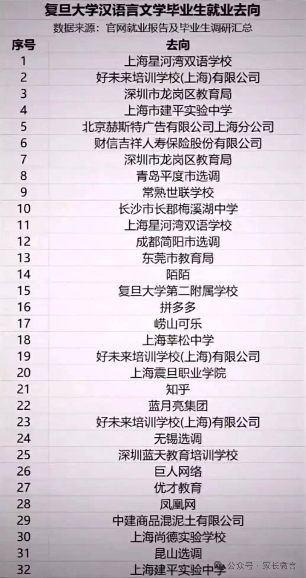 近日,网传复旦大学汉语言文学专业毕业生就业去向表在家长圈中流传,从表中看到,大部分的汉语文文学专业的毕业生还是去了教育行业,其中有民办学校,也有去教育培训机构,也有去了教育系统,对此网友议论纷纷: