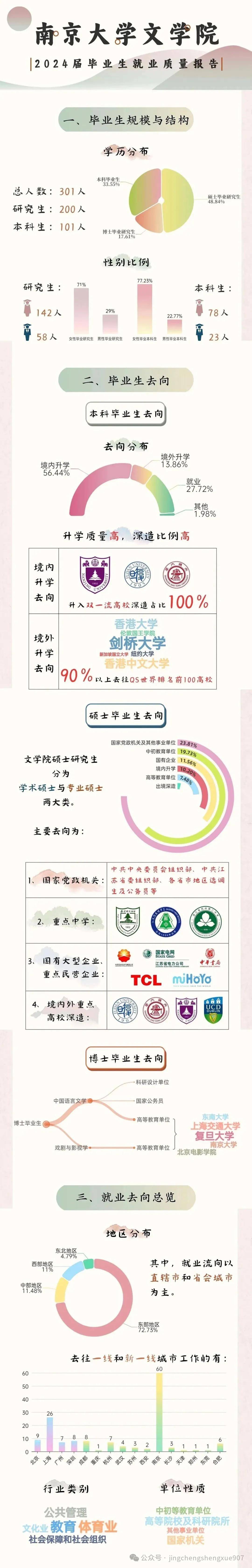 南京大学文学院硕士毕业就业质量还不错,公务员、事业单位、高校教师占比达到30%,初高中教师占比20%,国企央企占比11%。