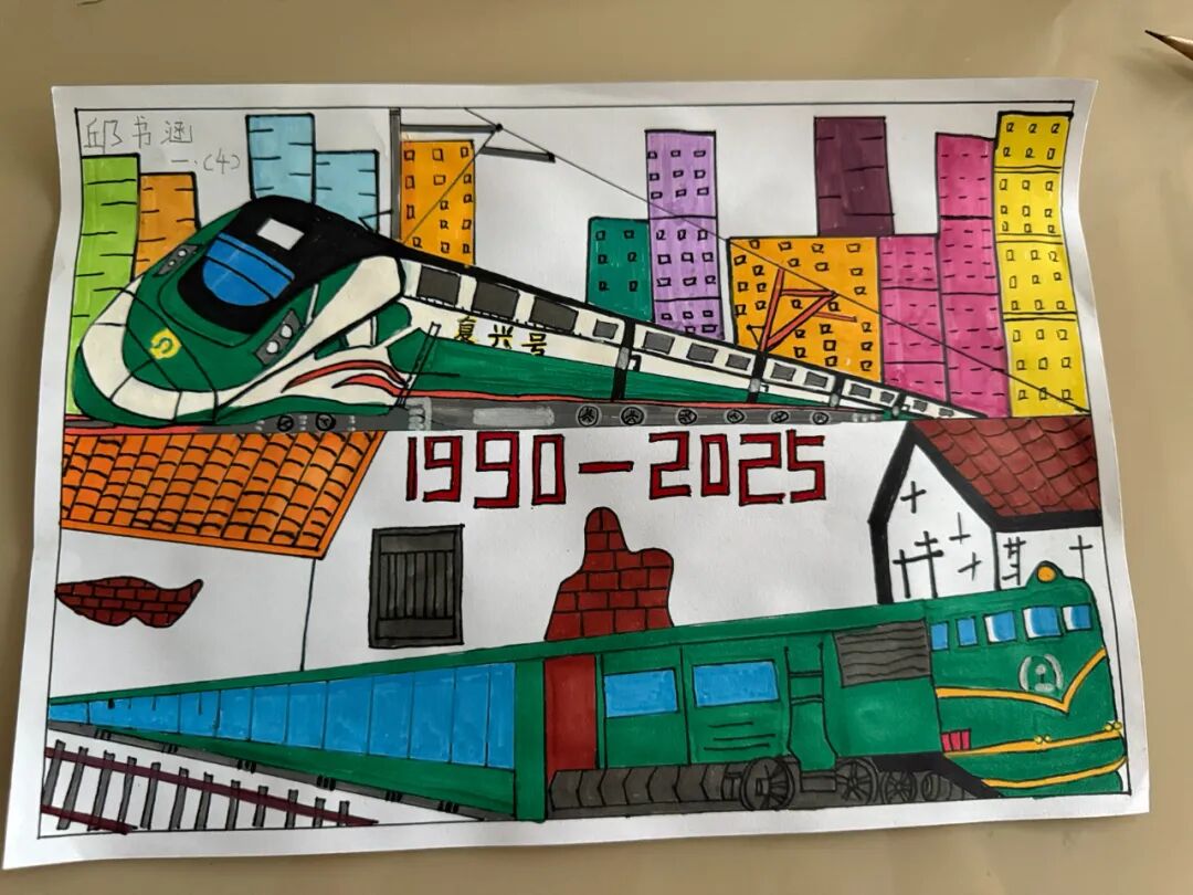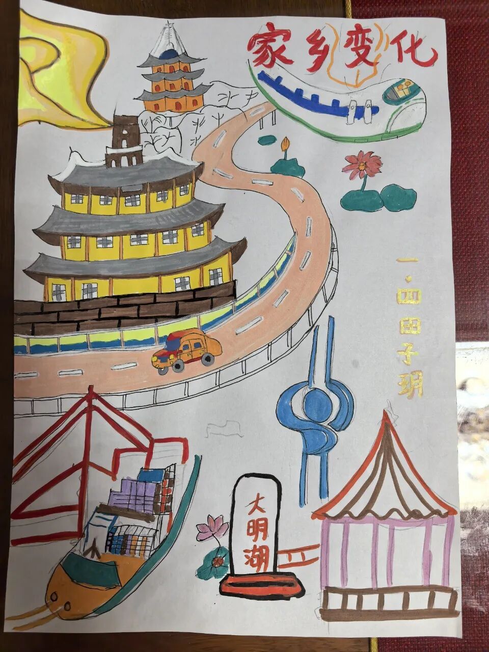 孩子们的画,是对家乡变化最真的解读:有的画“住房变形记”:从红砖墙、黄瓦片的小屋,到粉紫色、蓝绿色的高楼,房子的颜色越来越亮,也越来越高;有的画“交通进化史”:石子路、自行车不见了,取而代之的是大马路、小汽车,还有天上飞的飞机;还有的画“生活小碎片”:小桥流水的旧景边,冒出了甜品店、高楼和“和谐号”动车……每一笔色彩,都是孩子对“家乡长大”的惊喜发现。