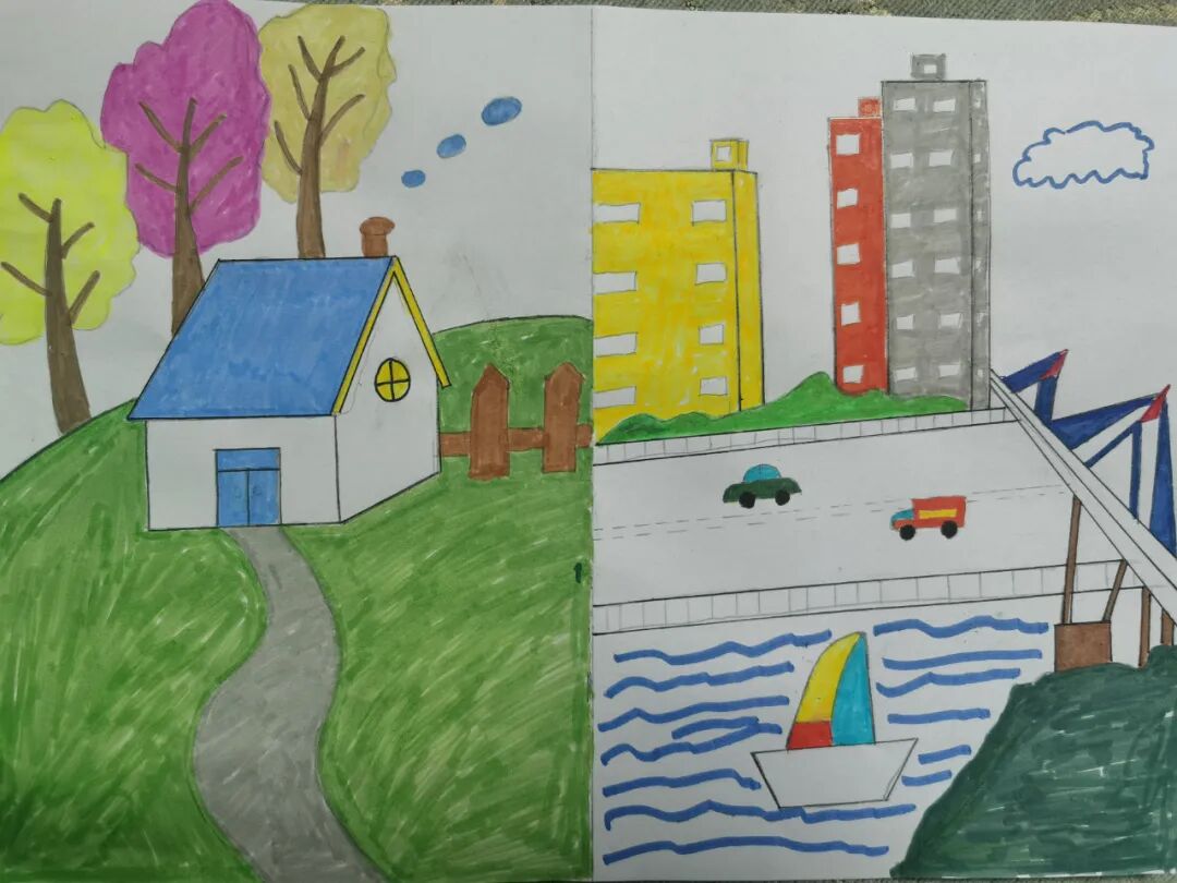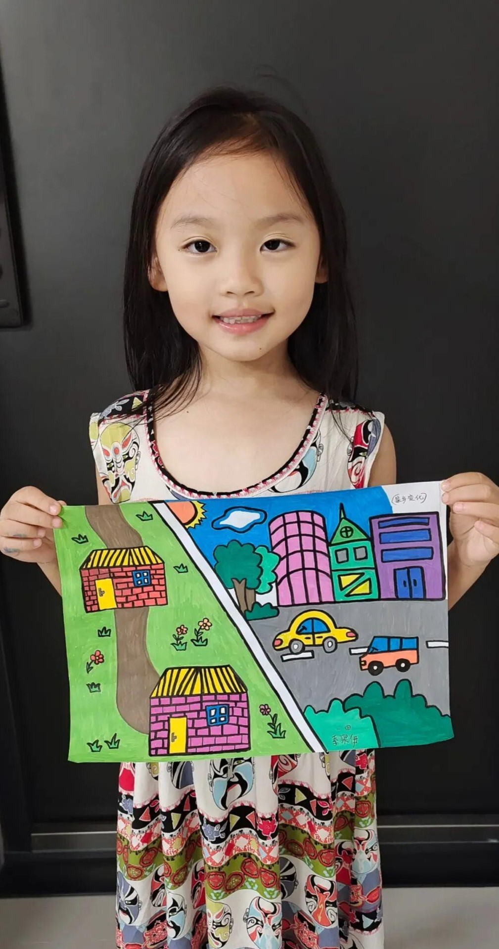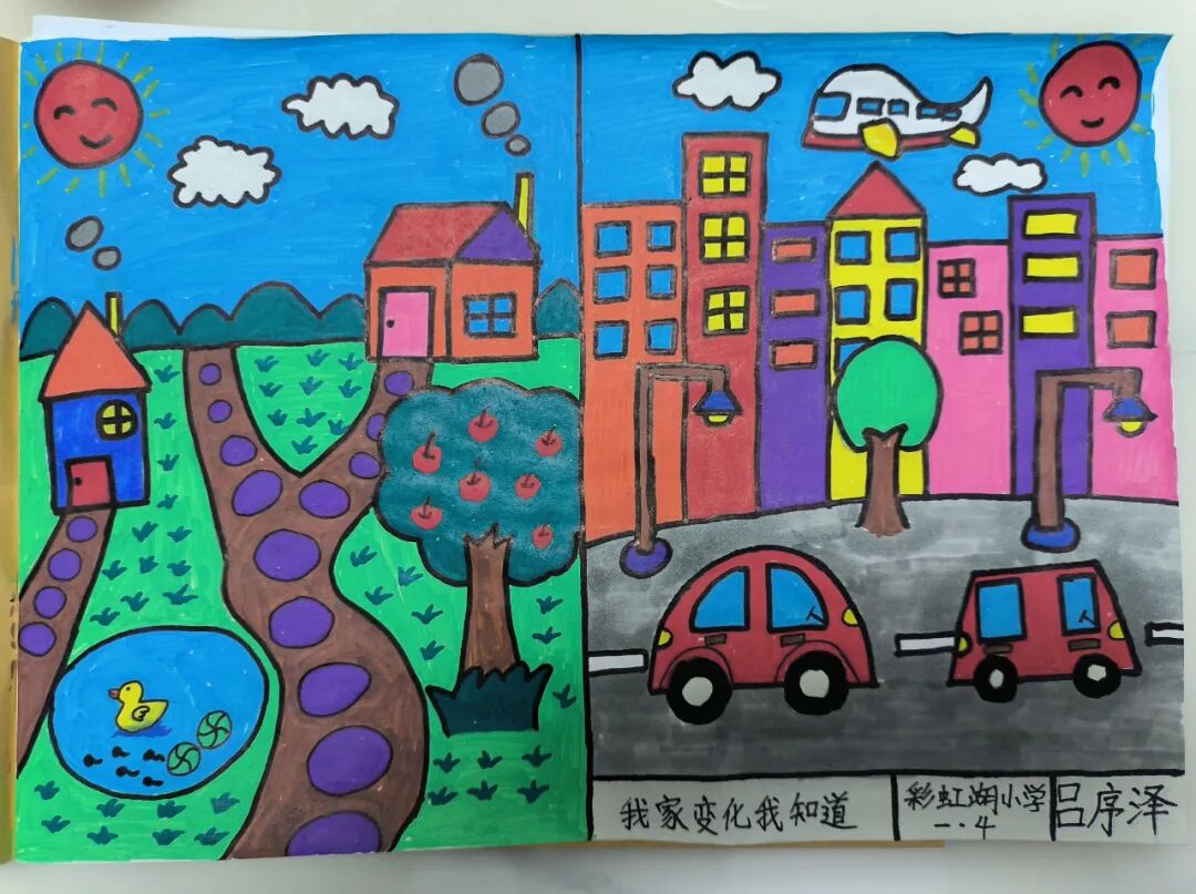 你看吕序泽同学的画,左边是长辈记忆里的乡间小屋、石子路、池塘小鸭,右边是色彩斑斓的高楼、汽车和天上的飞机,连太阳都在两边露出不同的笑脸,像是在为“变化”点赞;还有孩子画里的“新旧家乡PK”,红砖小屋旁的小花,和高楼大厦前的绿树相映成趣,把“过去”和“现在”缝在了同一张画纸上。