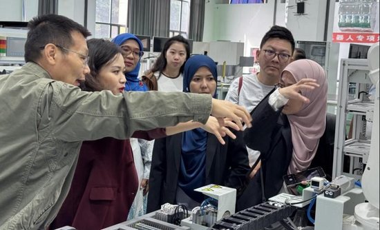 为使理论落地,学院开放了机电工程、轨道交通等院系实训中心。在高度仿真的现代化实训室里,马来西亚学员们亲眼见证了智能机器人精准操作,并亲手体验了关键实践环节。济南工程职业技术学院学生娴熟的技能展示与先进的设备令他们赞叹不已。随后,学员们走入特别设计的双语课堂,在“理论讲解+实操演示”的沉浸式教学中,迅速掌握了技能要点。这种“眼见为实、动手为证”的教学方式,让中国职业教育的“高标准、严要求”深入人心。