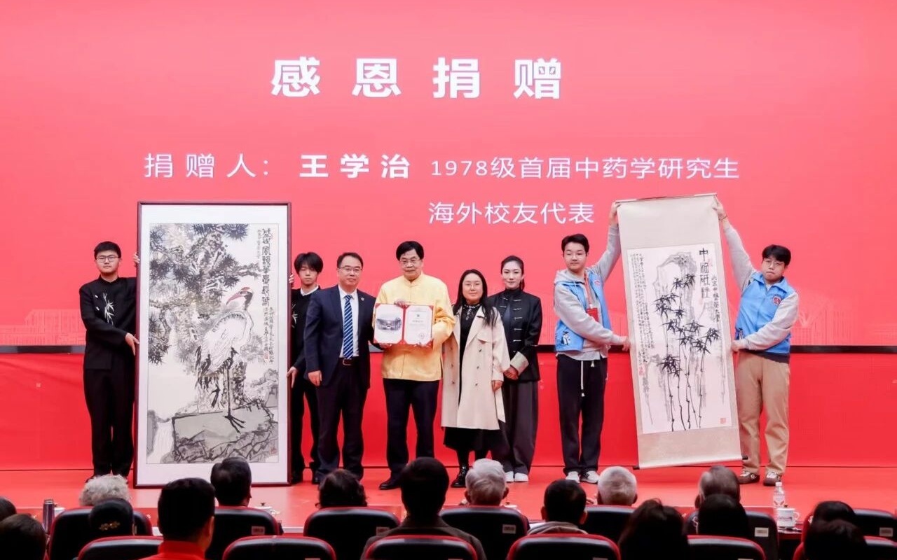 为表达对母校的感恩之情,1996级中医学专业博士校友、东阿阿胶股份有限公司高级技术专家宋冰代表公司,管理学院已故退休教师袁玉兰之子何源泉、1976级中医学院校友李玉贤和金明月夫妇之孙李韦枢分别代表母亲和祖父母,向母校捐赠资金;1978级首届中药学研究生、海外校友王学治,向母校捐赠精心创作的2幅国画作品《盛世风韵》《中流砥柱》;1993级中药专业校友丁锐向母校捐赠刘渡舟、王绵之、颜正华、贾维胜四位国医大家留下的4幅墨宝。