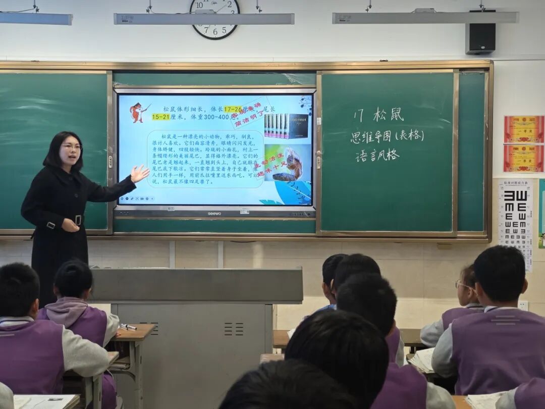课堂是教学实践的核心阵地,专家团队首先深入班级,听取了刘倩倩、刘婷婷、张莹莹三位教师的展示课,全程观察 “三段六环” 模式在不同学科的落地效果。其中,刘倩倩执教五年级语文《松鼠》时,紧扣文本重点,按 “目标导学 — 探究合作 — 总结提升” 的环节推进:先通过多媒体展示松鼠图片导入,引导学生明确 “理解松鼠外形与生活习性描写” 的学习目标;随后组织学生分组朗读相关段落,有的学生还模仿松鼠蹦跳的动作辅助理解,在讨论 “作者用‘小毛球’比喻松鼠尾巴的好处” 时,多名学生举手分享观点,既培养了阅读理解能力,也激发了对小动物的喜爱。