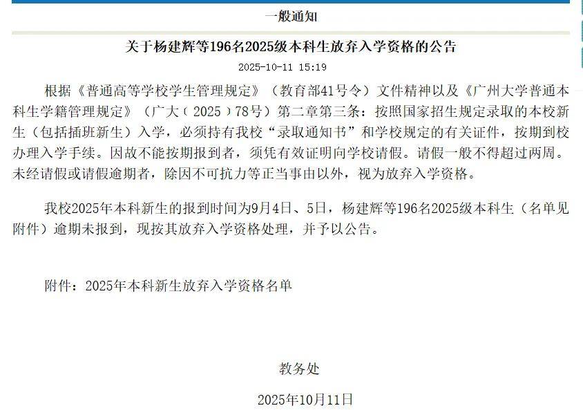 小观搜索发现,高校新生放弃入学这一现象很常见。例如广州大学教务处日前也发布了《关于杨建辉等196名2025级本科生放弃入学资格的公告》。