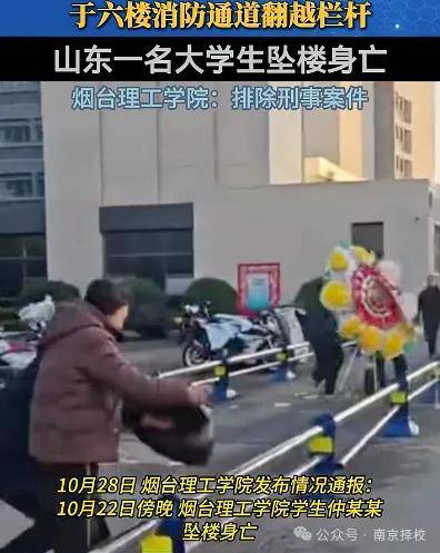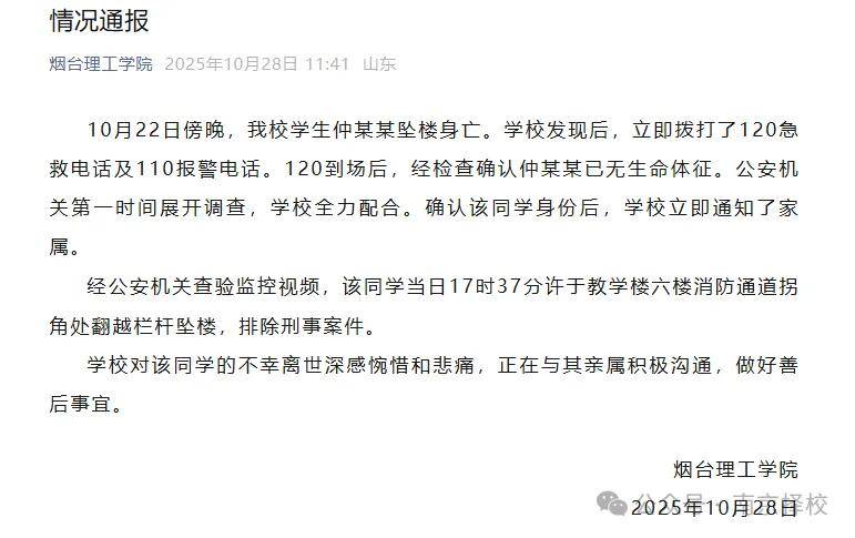 10月28日,山东烟台理工学院通报:10月22日傍晚,我校学生仲某某坠楼身亡。学校发现后,立即拨打了120急救电话及110报警电话。120到场后,经检查确认仲某某已无生命体征。公安机关第一时间展开调查,学校全力配合。确认该同学身份后,学校立即通知了家属。