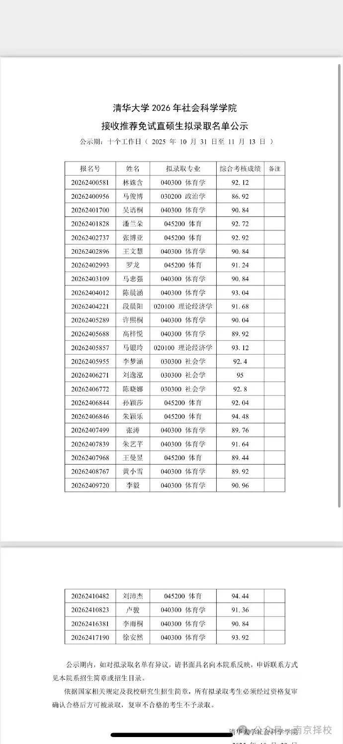 10月30日,清华大学2026年社会科学学院接收推荐免试直硕生拟录取名单公示,乒乓球运动员孙颖莎和王曼昱拟录取。