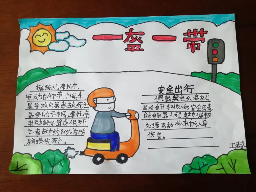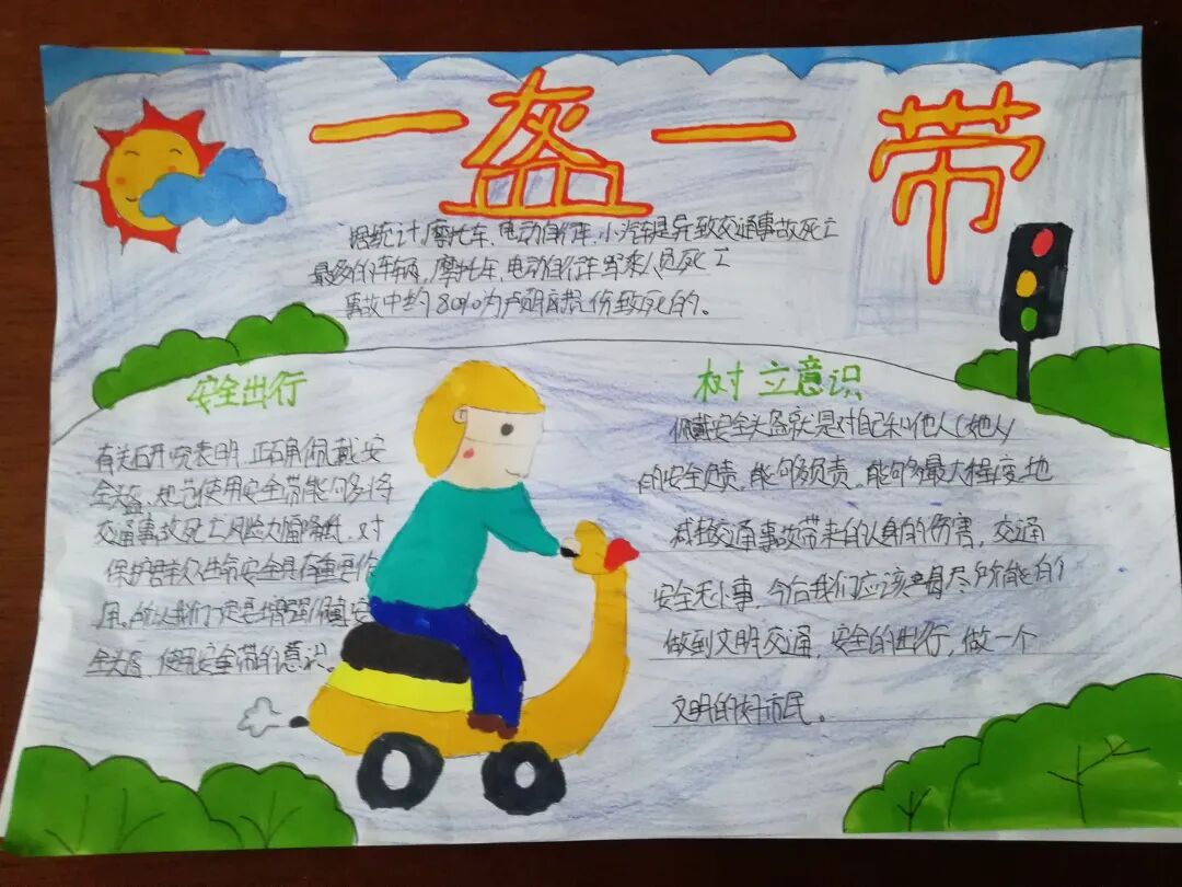 同时,学校组织“一盔一带”主题手抄报创作活动,学生们踊跃参与。大家用五彩画笔将交通安全知识融入作品:有的以漫画形式画出“佩戴头盔前后的安全对比”,有的用醒目文字标注“一盔一带,安全常在”等标语,还有的列出日常出行安全注意事项,如“不乘坐超员车辆”“过马路走人行横道”等。优秀作品在校园宣传栏集中展示,吸引师生驻足观看、交流,进一步扩大了安全教育覆盖面。