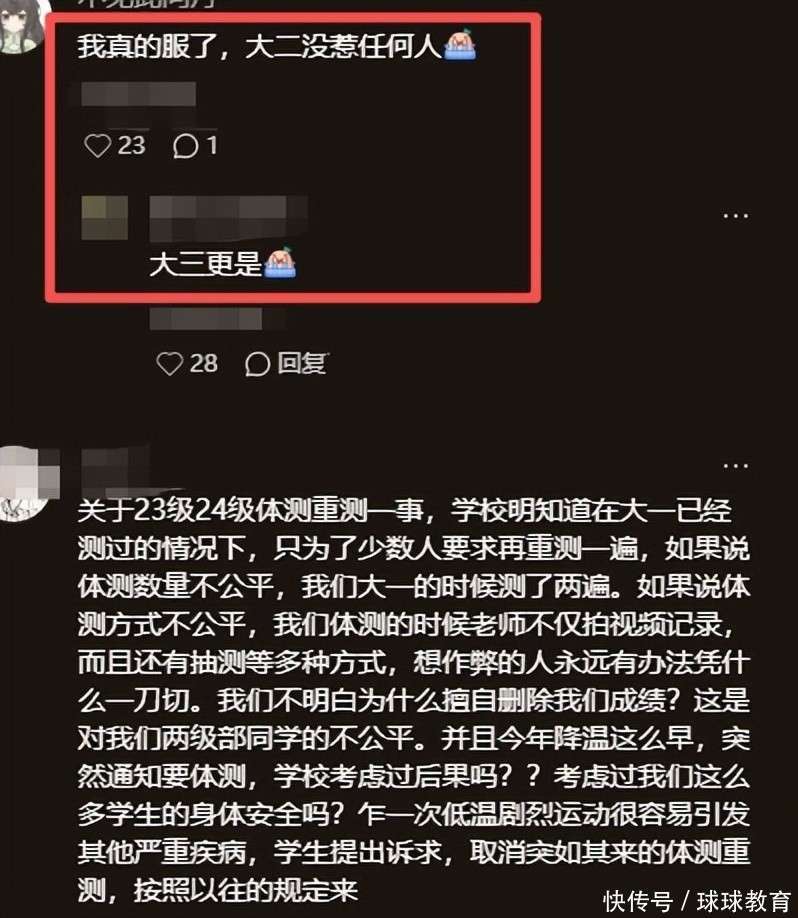 这波操作直接给大二、大三的学生气笑了,如果说体测成绩存在问题,那自己大一测了两次又算什么?还是说这些大一的新生只是单纯地看不惯自己体测,而大二、大三的人不用体测?