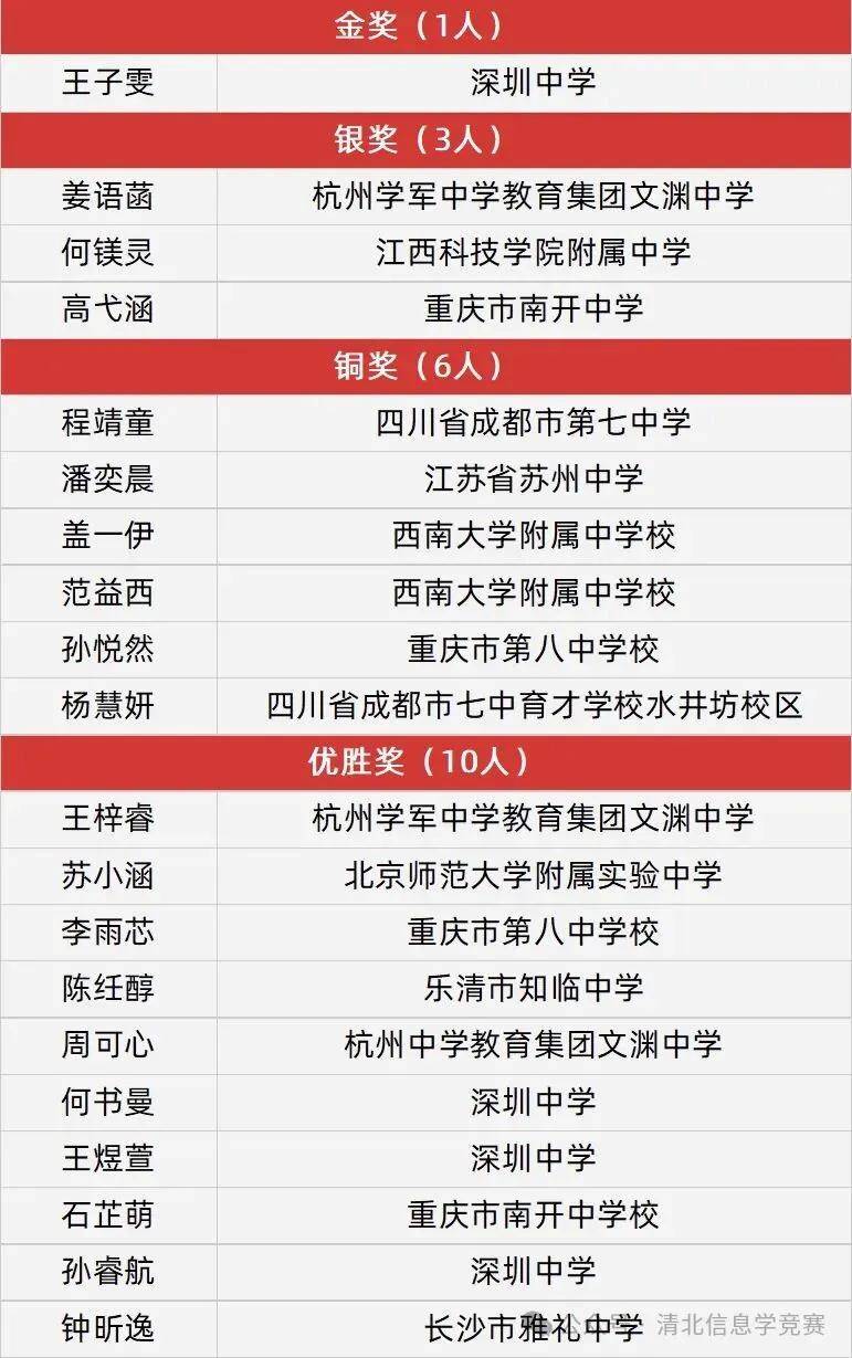 此次比赛共评选出诺特奖金奖1人、银奖3人、铜奖6人,优胜奖10人,唯一金奖由来自深圳中学的王子雯获得。