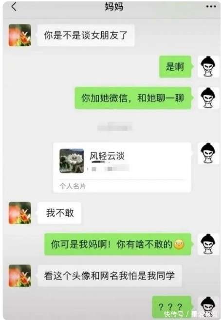 可是没有想到妈妈看到儿子推给她的联系方式后,却表示“我不敢”,学生反问,你可是我妈啊,你有啥不敢的,没想到老妈语出惊人,她表示看到这个人的头像和网名,我怕是我同学。