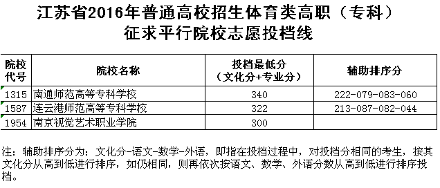 江苏省2016年普通高校招生,体育、艺术类高职(专科),征求平行院校志愿投档线